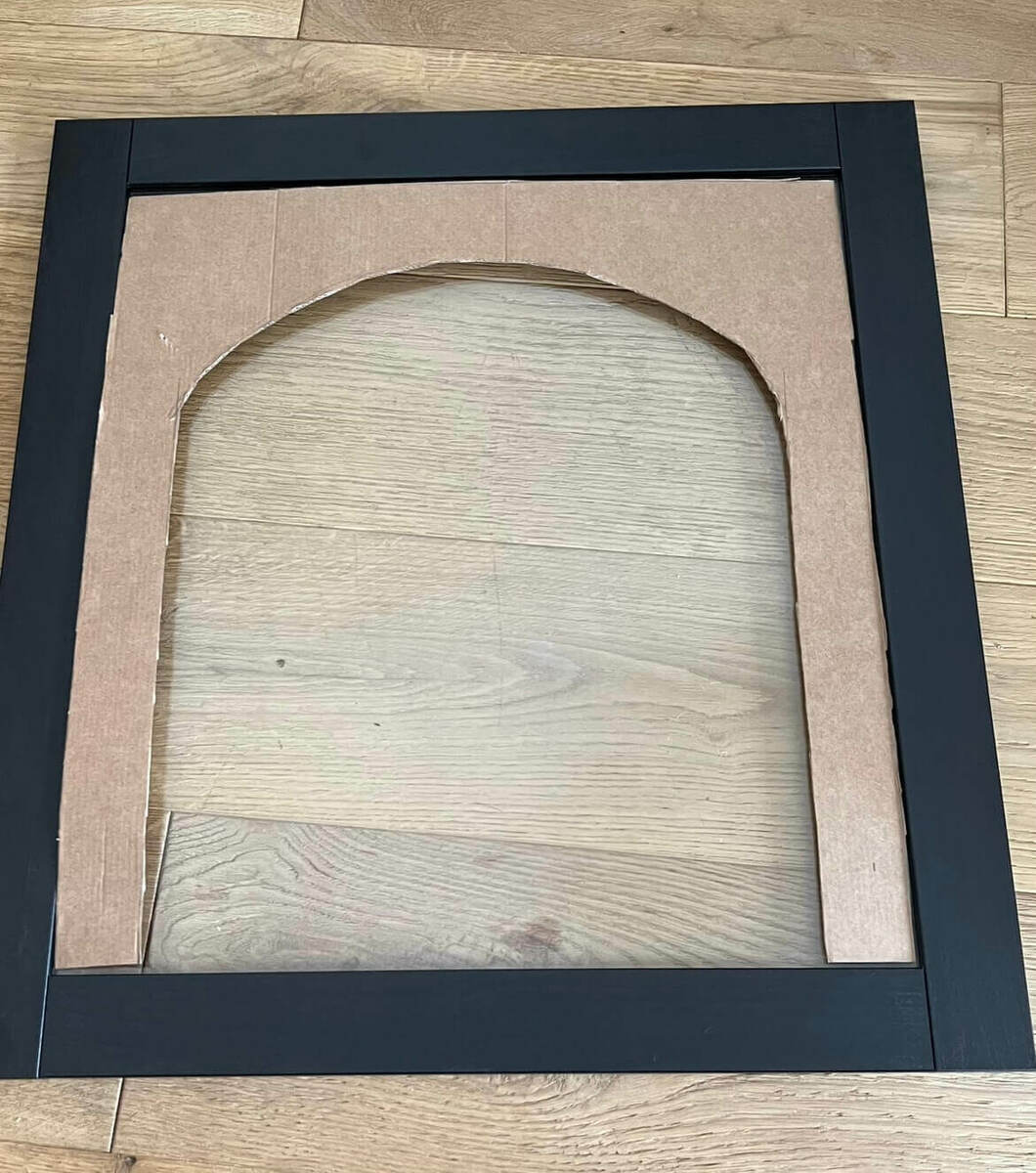 To add doors to the front of your cabinet, cut out a 6mm (1/4”) MDF board to fit right into the glass section of the SINDVIK doors. Next, cut out an arch shape in the center. Our friend used a (new) toilet seat as a utensil, and it created the perfect arch shape! Once you've got the right shape, prime and paint the MDF pieces and door frames using the same products you used for the cabinet.