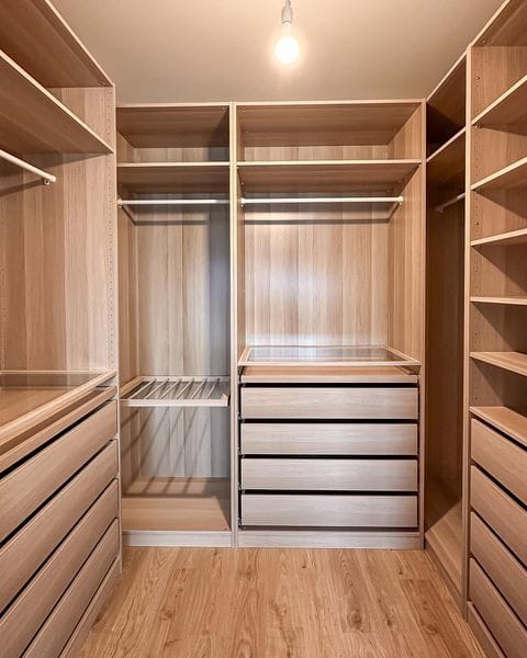 Why we like it: This IKEA wardrobe hack uses the PAX unit to optimize floor-to-ceiling space, adding practical storage and organization. The 'white stained oak' finish blends well with the room, and the option to expand or add wicker baskets offers flexibility. The potential for different lighting, like lamps or LEDs, gives it a customizable touch. It's a sensible use of ready-made furniture.