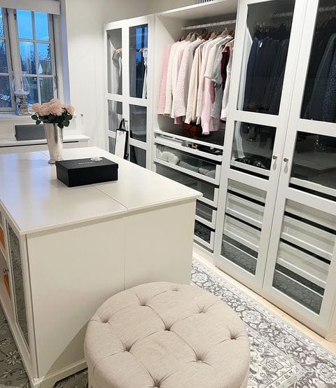 Why we like it: The IKEA PAX system, with Tyssedal glass doors, offers an affordable solution that organizes clothes and accessories with ease. The island, crafted from two Listorp sideboards, offers additional storage for shoes and boots, while also serving as a convenient laundry folding space. The current setup maximizes available space, showing that IKEA can adapt to any home.