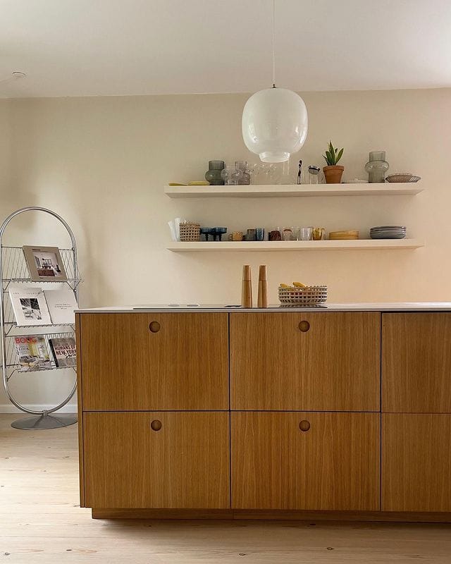 Why we like it: The repurposing of IKEA Lack shelves into stylish floating shelves demonstrates an innovative and budget-friendly approach to home decor. These 190cm shelves, once merely functional, are now a statement piece in this kitchen.