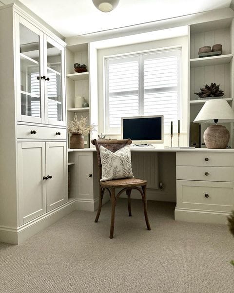 Why we like it: This study transformation is a testament to patience and creativity, demonstrating that IKEA units can morph into bespoke built-ins! The units, beautifully painted in Coat Paint's 'Pampas', blend harmoniously with Cormar Carpets' 'Flagstone'. The stylish chair and lamp complete the inviting space.