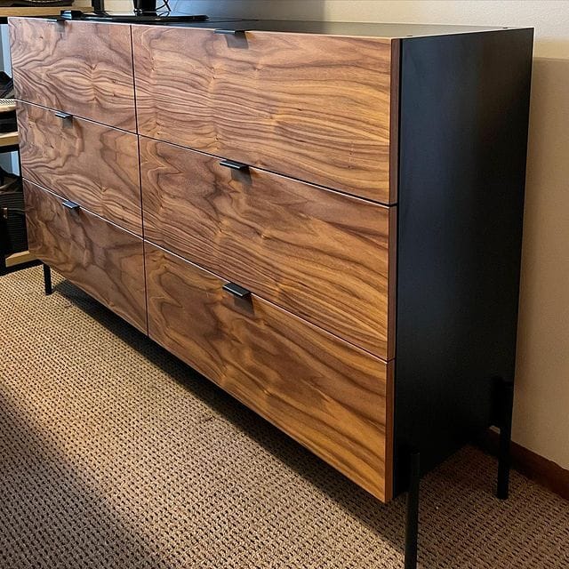 Why we like it: Here's a brilliant furniture transformation we love! A much-needed dresser upgrade resulted in an ultimate hybrid, beautifully combining elements from four vendors. Black cabinet boxes from Swedeboxx, walnut fronts from Semihandmade, IKEA drawers, and legs and pulls from Norse Interiors merge to create this stylish and functional piece. It turned out great!