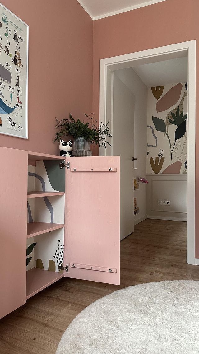 Why we like it: The customized IKEA IVAR cabinets showcase brilliant design details. The unexpected "Safari" wallpaper inside adds a fun, visual twist. Wallpaper on the interior elevates the cabinets and creates an element of delightful surprise. Paired with the muted rosa mit braun exterior, it strikes a balance of elegance and adventure. Brilliant work!